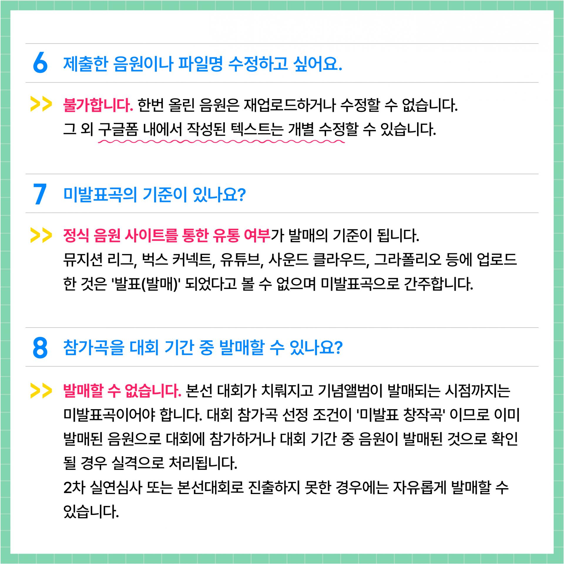 대회 참가곡 선정 조건이 '미발표 창작곡' 이므로 이미 발매된 음원으로 대회에 참가하거나 대회 기간 중 음원이 발매된 것으로 확인 될 경우 실격으로 처리됩니다.