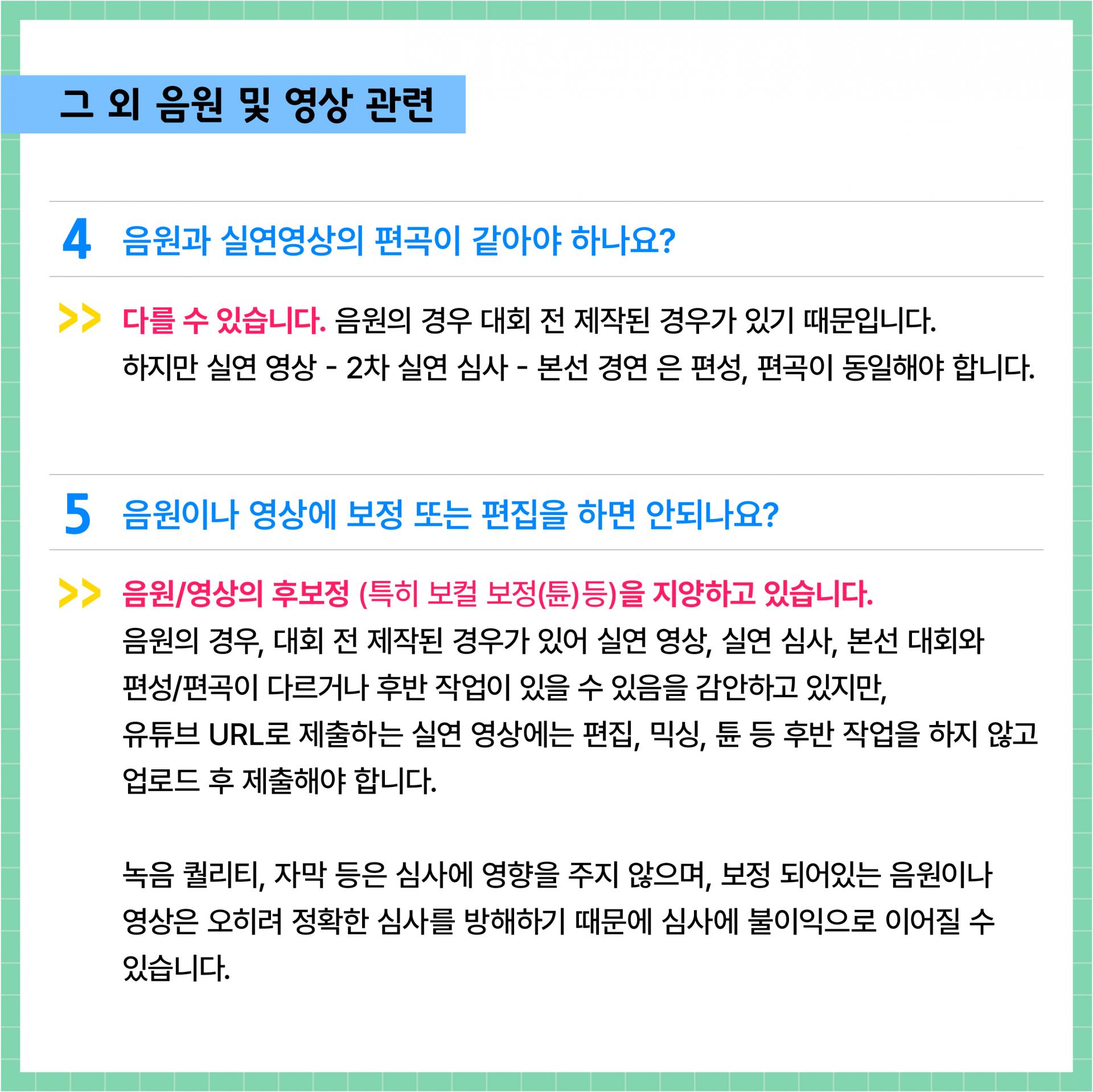 실연 영상의 화면을 편집, 보정하거나 가사/자막을 삽입하는 것 역시 심사에 영향을 주지 않으므로 지양해주시기 바랍니다.